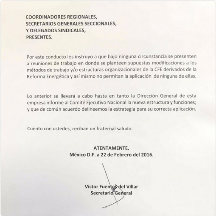 Si bien el SUTERM forma parte de la Confederación de Trabajadores de México (CTM) y ésta del Partido Revolucionario Institucional (PRI), el pasado 22 de febrero, la dirigencia difundió una carta prohibiendo a sus agremiados presentarse en “reuniones de trabajo en donde se planteen supuestas modificaciones a los métodos de trabajo y/o estructuras organizacionales de la Comisión Federal de Electricidad”.