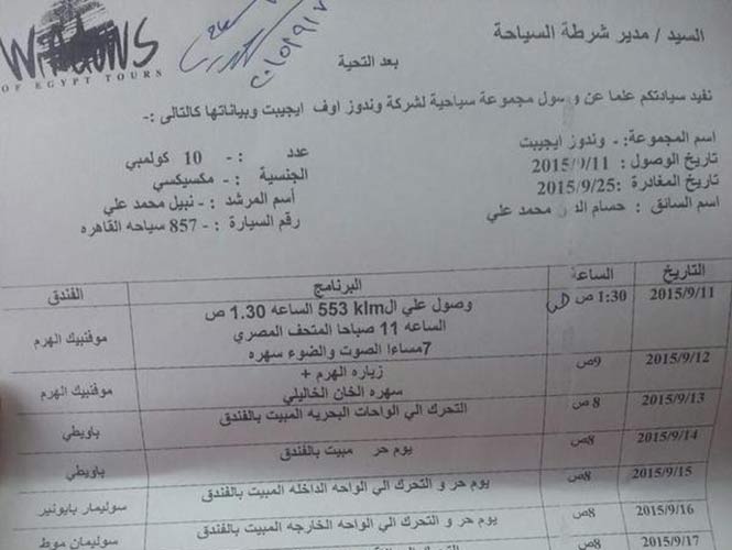 El sindicato hizo público el permiso obtenido por la empresa de viajes “Windows of Egypt”, la cual informó a la Policía turística del itinerario del grupo de turistas mexicanos, que salió el día de ayer desde El Cairo y se dirigía al oasis de Bahareya cuando tuvo lugar el incidente.